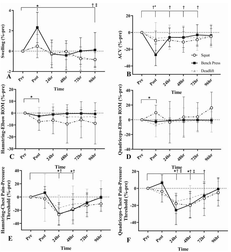 - DOMS: Aumentó significativamente en el press de banca y la sentadilla, pero solo en el cuádriceps en el peso muerto (Figura 1E y 1F). El DOMS fue mayor en el press de banca que en el peso muerto inmediatamente después del ejercicio, y mayor en la sentadilla que en el peso muerto en algunos puntos temporales posteriores al ejercicio.